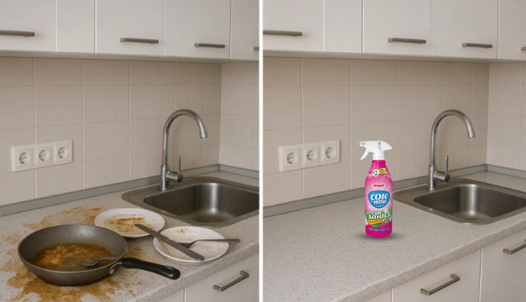 Tüm Mutfaklar: Krom, mermer, epoksi ve türevleri, sıcak – soğuk yüzeyler, karbon – is – yağ ve başka kirler. ÇOKHOSH Temizleyici hızlı ve derinlemesine temizler zarar
