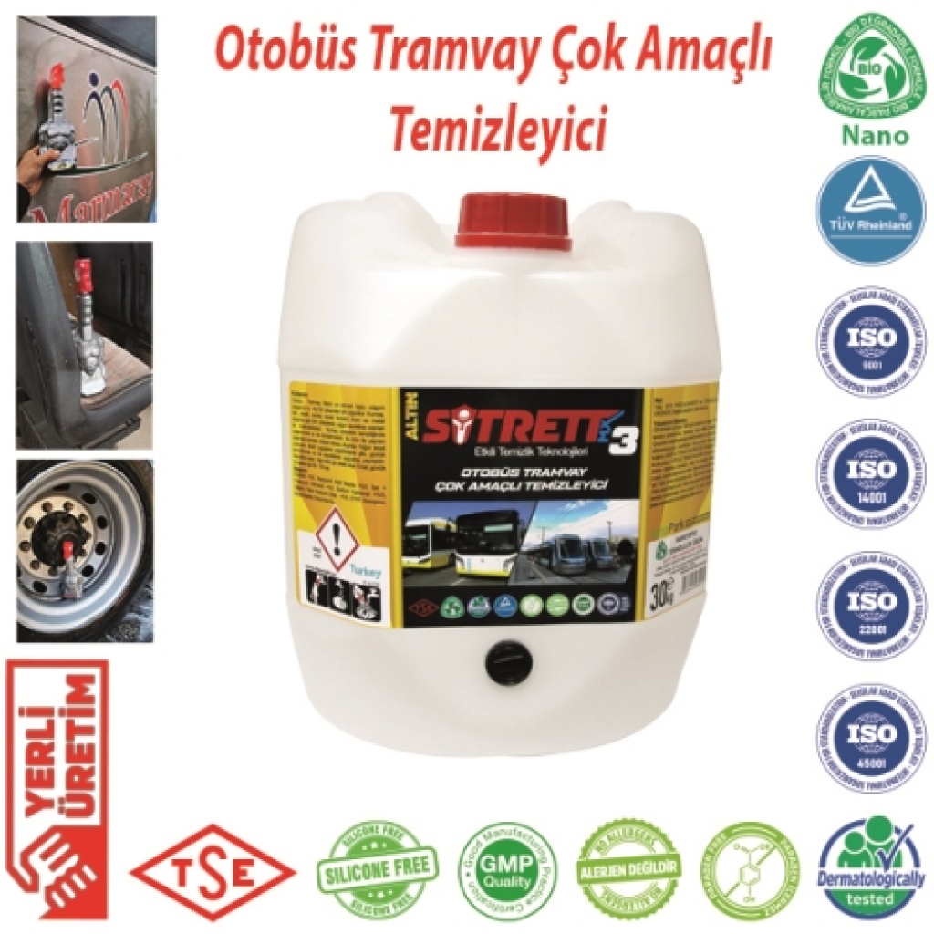 Otobüs, Tramvay, Metro ve benzer toplu ulaşım araçlarının iç - dış tüm aksamları için uygundur. Kumaş, deri, plastik, epoksi, boyalı boyasız krom ve metal aksamlar gibi tüm yüzeylerde, uygun seyreltme oranları ile kullanabilirsiniz. Kumaş yüzeylerin temizliğnde kullanımında su ile durulanmalıdır. Bu ürün ile yapılan yıkamalar sonrası rutubet kokusu oluşmaz. Yoğun lekeli yüzeylere direkt uygulama yapabildiğiniz gb, günlük temizliklerde su ile seyrelterek uygulama yapılabilir. Seyreltme oranı : Ağır kirler için direkt veya 10 kat, günlük temizlikler için 50 - 100 kat. 0254044 TSE Belgesi dahilinde Stabilite testleri yapılmıştır. Ambalajlar kilitli kapaklıdır. Ürün konsantredir. Otomatlarda 70 kat (1/70), elde kullanımda 10 kat seyreltilebilir. Kötü koku oluşumunu engeller. Nano teknoloji üründür. Biyo parçalanabilir ürün belgesine sahiptir.Kireç hariç aklınıza gelen tüm kirlenmeler ve tüm yüzeylerde kullanılabilir.