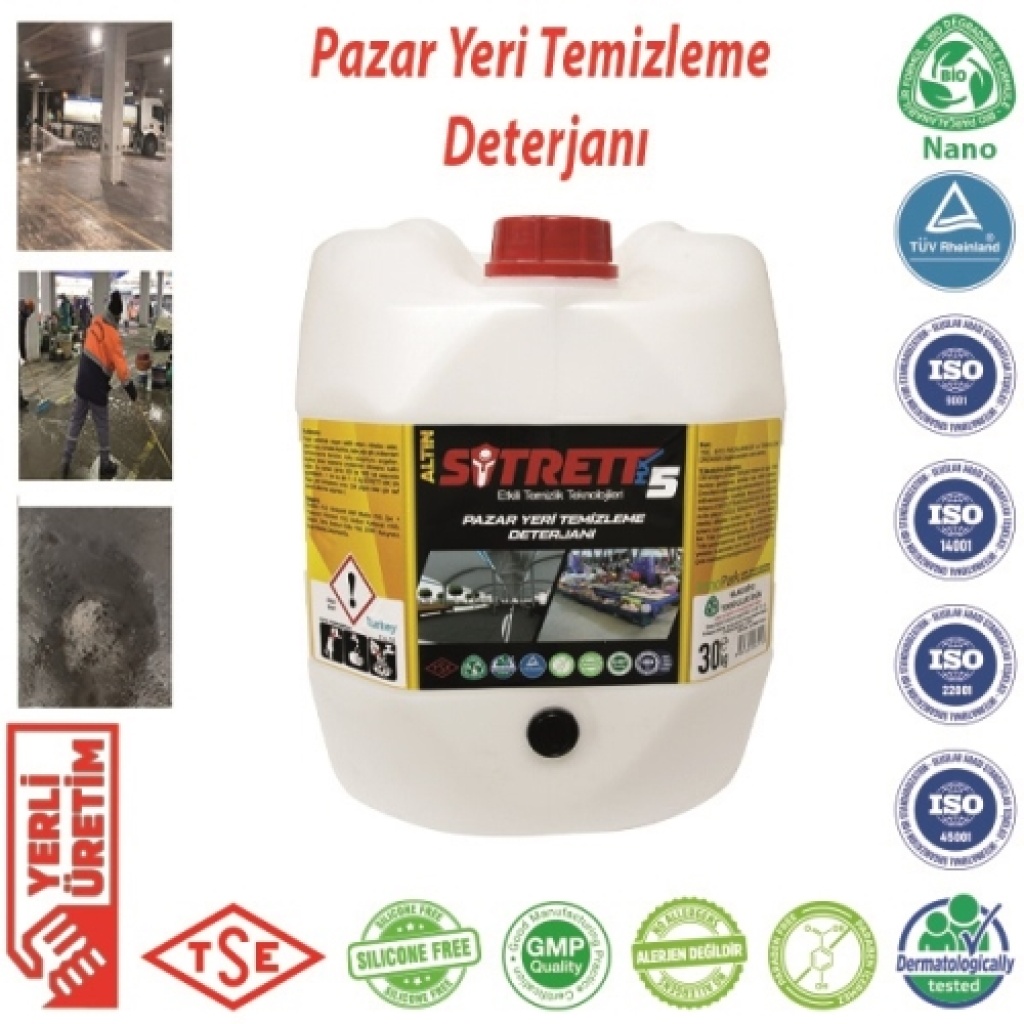 Pazar yerlerinde oluşan asidik ortamı nötralze eder, peynir suyu, domates kalıntısı, balık yağı gibi problemler derinlemesine temizler, koku oluşumunu engeller, böylece sinek toplanma probleminin bitmesine katkı sağlar. Su tankeri içinde 200 ile 1.000 kat arasında seyreltilebilir. ( 1 ton su için 1 - 5 kg STRMX-PYTD-3A Pazar yeri temizleme sıvısı. Çok yoğun kirler için saf olarak kullanıma uygundur ) 0254044 TSE Belgesi dahilinde Stabilite testleri yapılmıştır. Ambalajlar kilitli kapaklıdır. Ürün konsantredir. Otomatlarda 150 kat (1/150), elde kullanımda 20 kat seyreltilebilir. Kötü koku oluşumunu engeller. Nano teknoloji üründür. Biyo parçalanabilir ürün belgesine sahiptir. Kireç hariç aklınıza gelen tüm kirlenmeler ve tüm yüzeylerde kullanılabilir.
